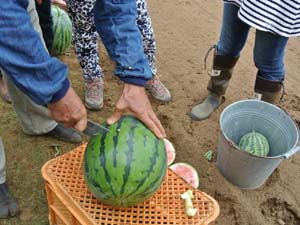 メロンの圃場から、すいかの圃場へ移動。すいかの圃場は、花が咲いてから47〜48日と、50日の圃場2ヵ所を見学し、それぞれの畑ですいかの食べくらべも行いました。