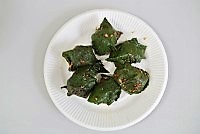 えごまの葉キムチの作り方は、お配りしたレシピにありますので、ごらんください。今日めしあがっていただくのは、家で4日前に漬けたものです。「ごはん泥棒」と呼ばれるくらいアツアツのごはんに合いますが、今日は小さなおにぎりを包んでお出しします。ぜひ香りを楽しんでください。