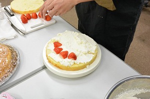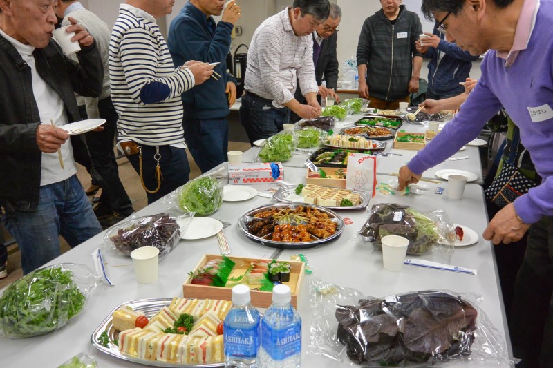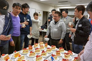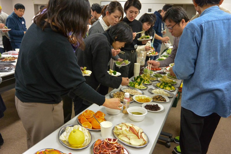 講演会後の「塾生交流の集い」では、一昨年の修了式の際に好評だった生クリーム泡立てからのケーキデコレーションと、毎年恒例の茶話会を行いました。 茶話会では、講師の船越康弘さんに急遽作っていただいた、しいたけ、じゃがいも、たまねぎ、キャベツ、にんじんなどの「重ね煮」や、調理スタッフによる洋風、和風2種類の「パワーサラダ」を味わいました。